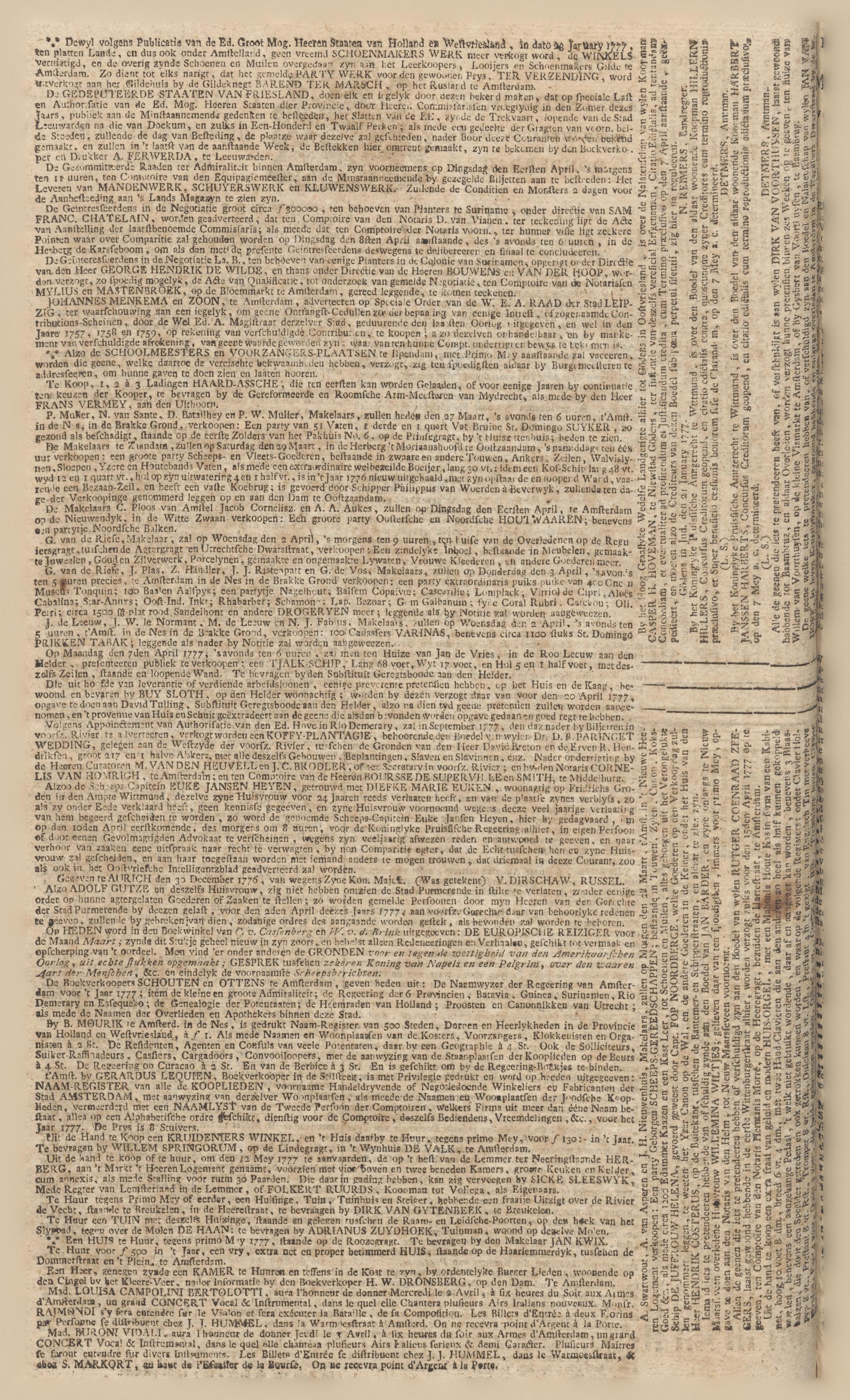 Uit de Hand te Koop een KRUIDENIERS WINKEL, en 't Huis daarby te Huur tegens primo Mey, voor ƒ. 130:- in 't Jaar. Te bevragen by WILLEM SPRINGORUM, op de Lindegragt, in 't Wynhuis DE VALK, te Amsterdam.