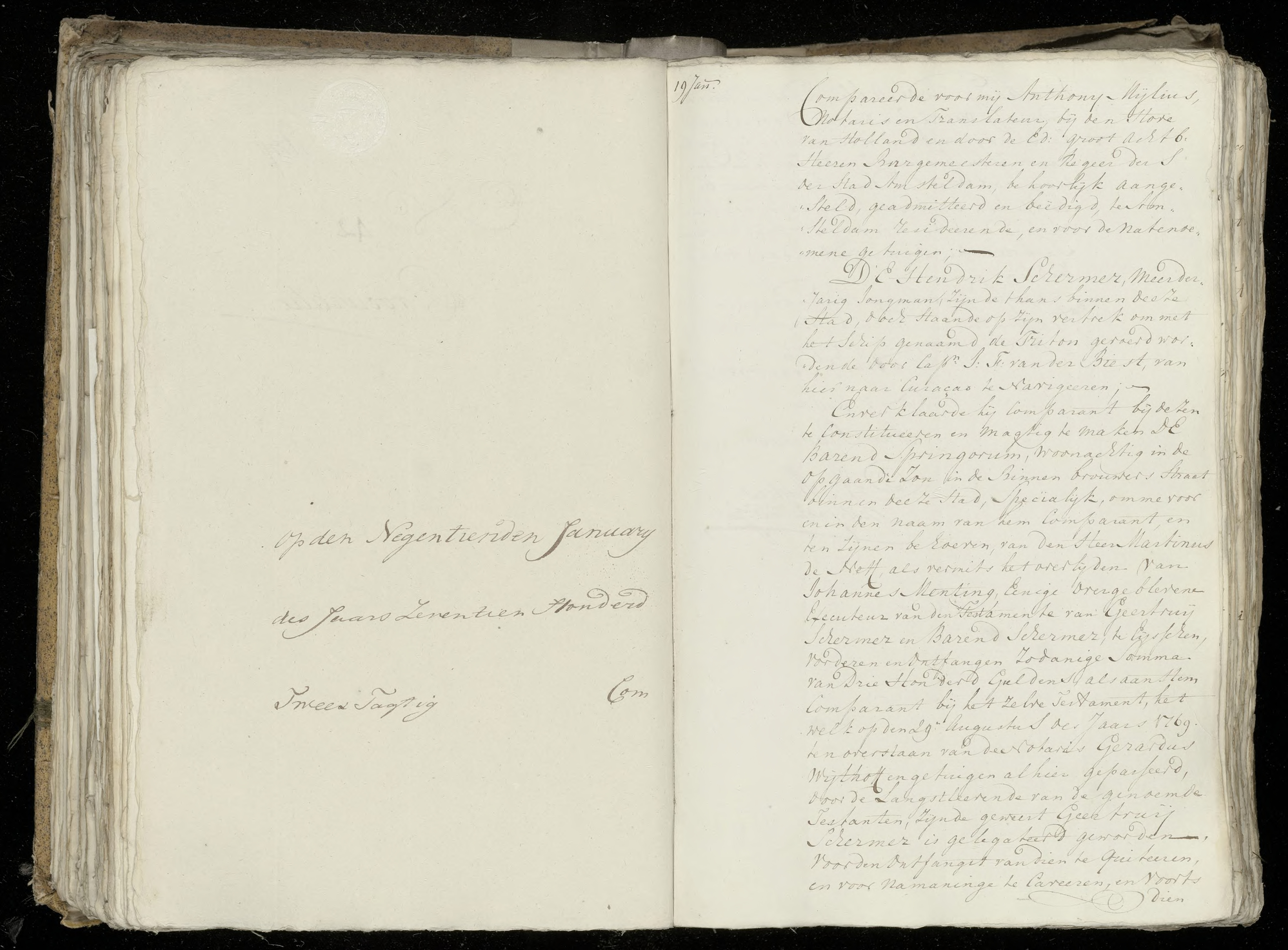 Compareerde voor mij Anthony Mylius, Notaris en Translateur, bij den Hove van Holland en door de Ed: groot Achtb: Heeren Burgemeesteren en Regeerders der stad Amsteldam, behoorlijk aangesteld, geadmitteerd en beƫdigd, te Amsteldam resideerende, en voor de natenoemene getuigen.