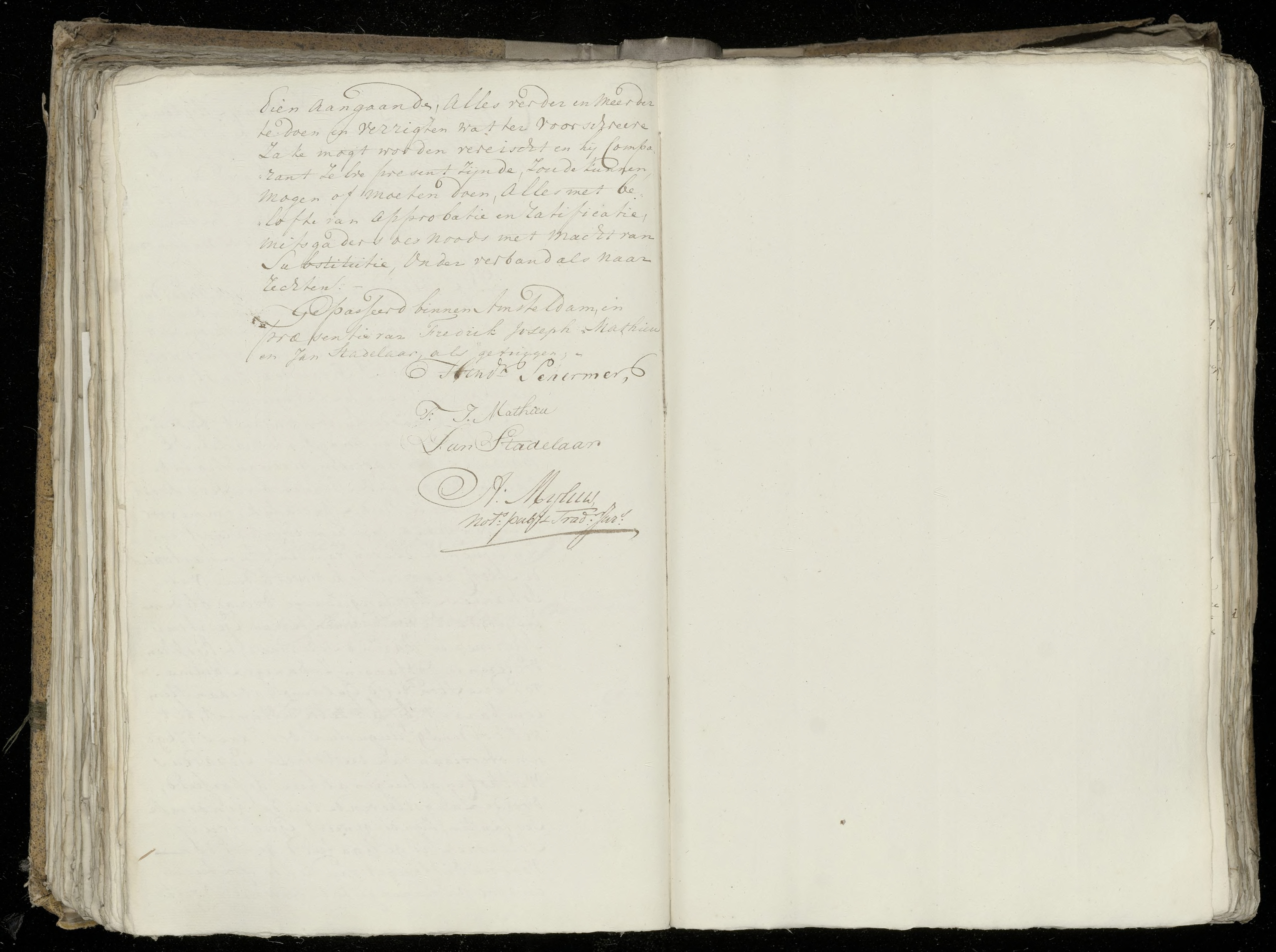 Gepasseerd binnen Amsteldam in praesentie van Fredrik Joseph Mathieu en Jan Stadelaar, als getuigen.