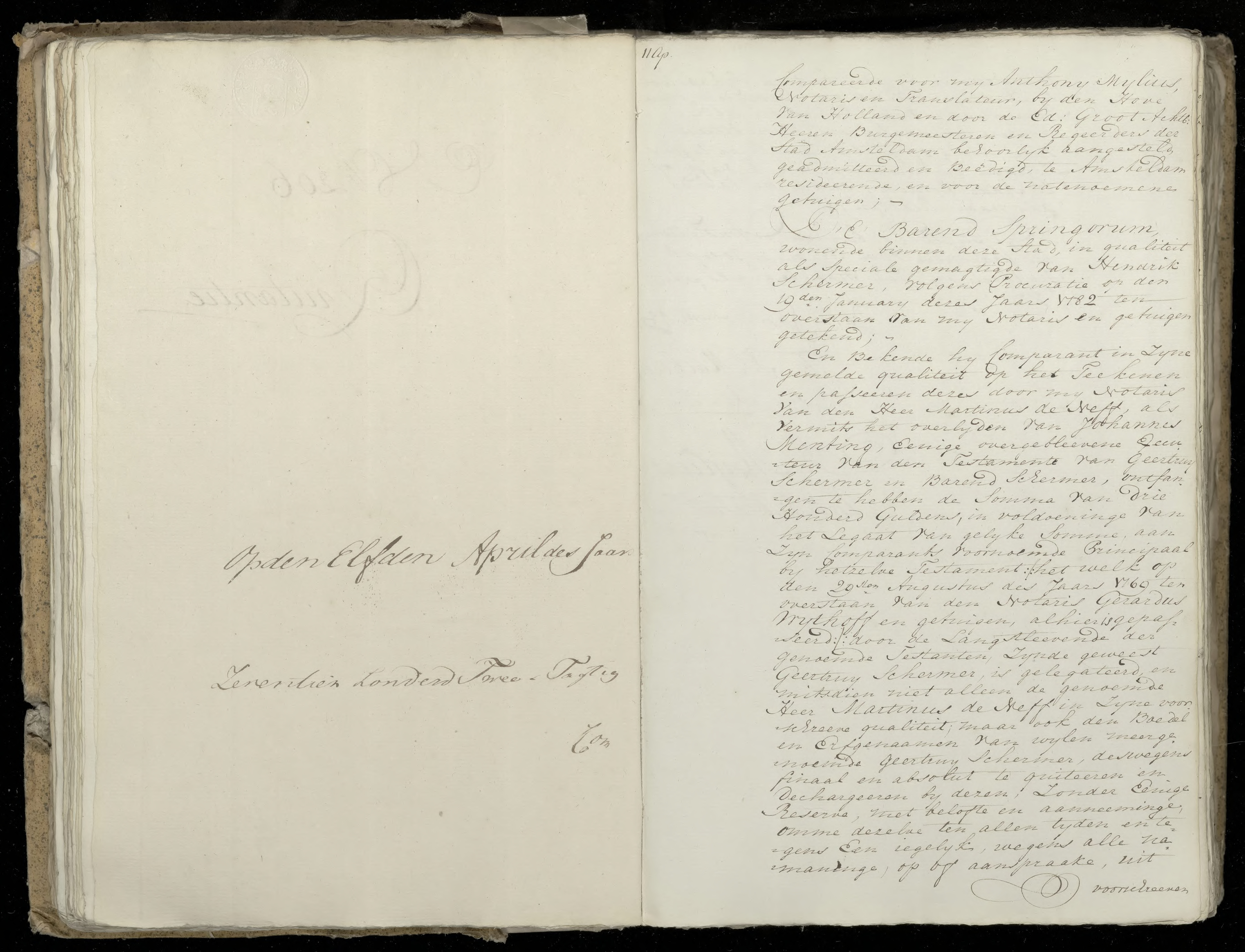 En bekende hij Comparant in zyne gemelde qualiteit, op het teekenen en passeeren dezes door mij Notaris, van den Heer Martinus de Neff, als vermits het overlijden van Johannes Menting, eenige overgeblevene Executeur van den Testamente van Geertruy Schermer en Barend Schermer, ontvangen te hebben de somma van Drie Honderd Guldens, in voldoeninge van het Legaat van gelyke somma, aan zyn Comparants voornoemde Principaal bij hetzelve Testament (het welk op den 29sten Augustus des Jaars 1769 ten overstaan van den Notaris Gerardus Wythoff en getuigen alhier is gepasseerd) door de Langstleevende der genoemde Testanten, zynde geweest Geertruy Schermer, is gelegateerd;