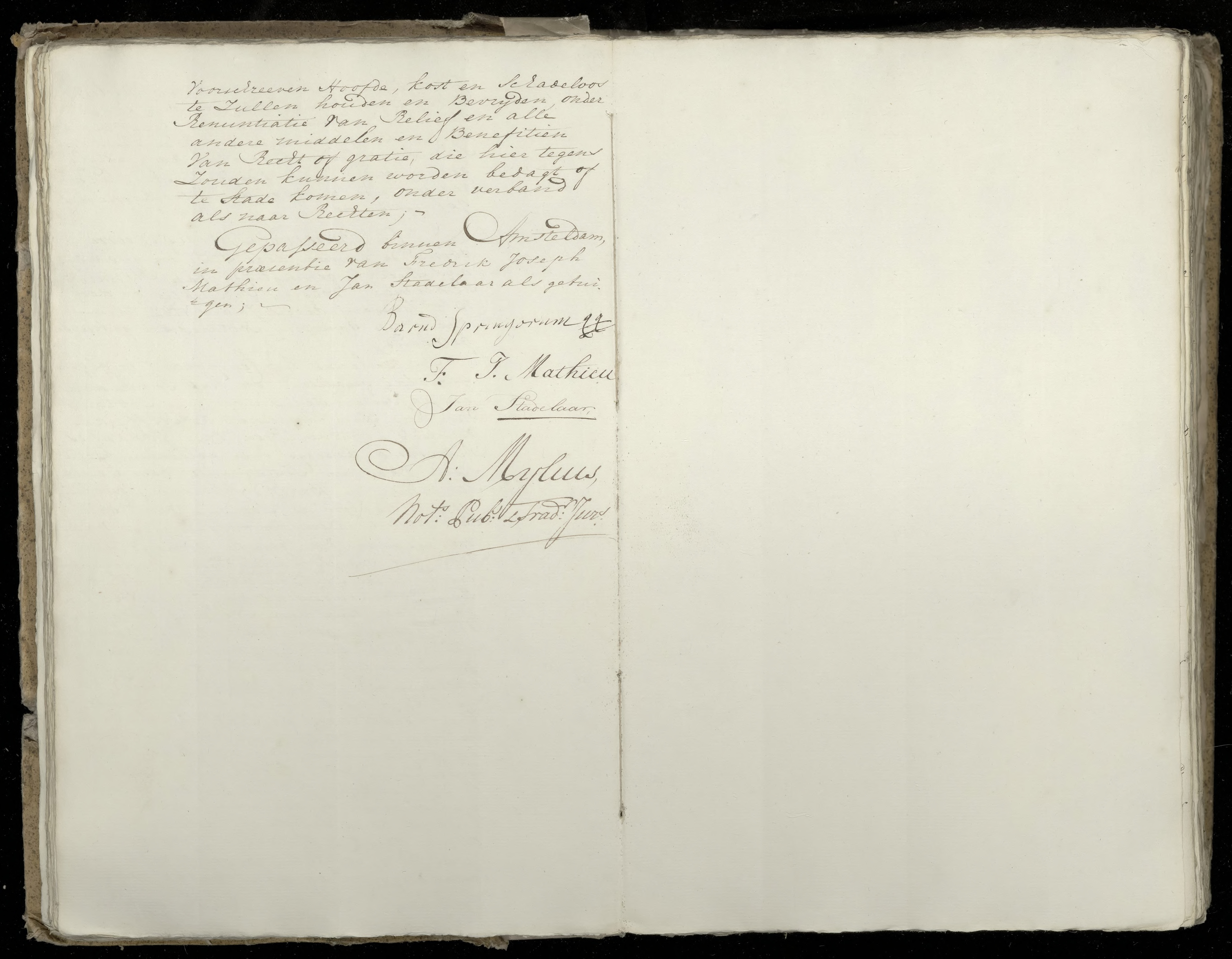 Gepasseerd binnen Amsteldam, in præsentie van Fredrik Joseph Mathieu en Jan Stadelaar als getuigen;