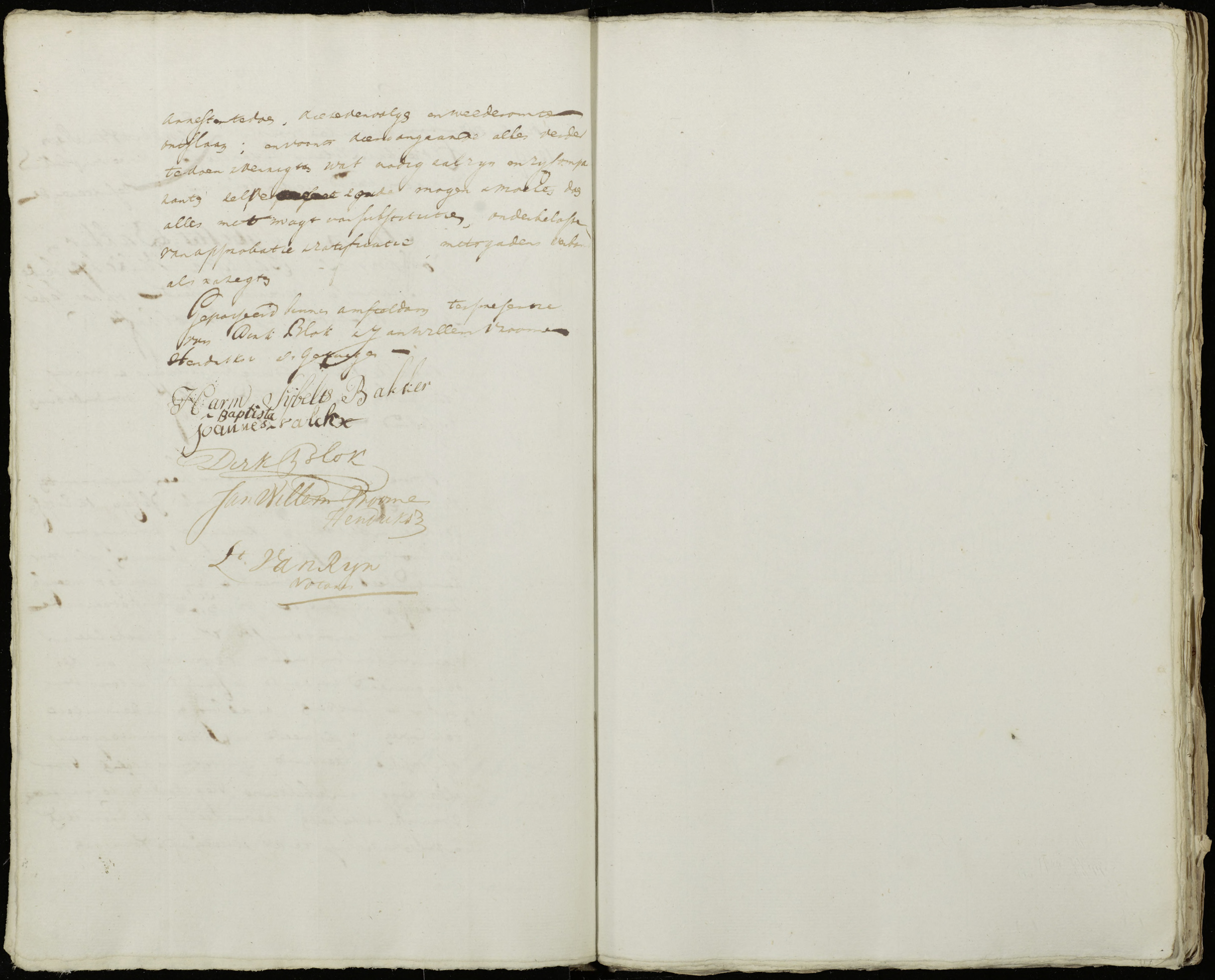 Den 1 October 1782 compareerden voor mij, Leendert van Rijn, openbaar notaris bij den Edelen Hove van Holland, geadmitteerd, te Amsterdam resideerende, Harm Sybelts Bakker en Johannes Baptista Valcke, beide als matrozen, gevaren hebbende op het kaperschip De Spion, kapitein Jan Olhoff.