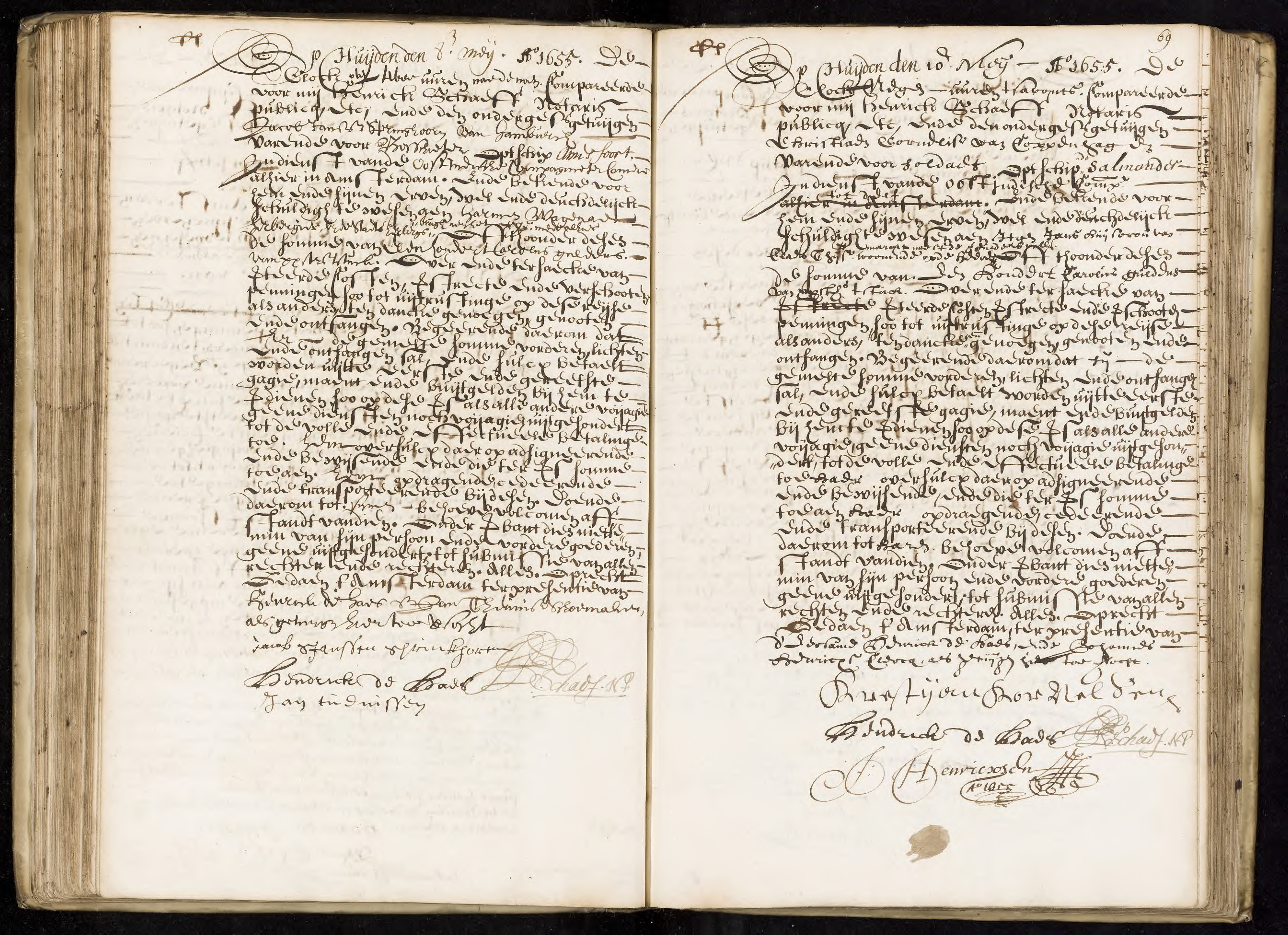 Notarial act dated 8 May 1655 in which Jacob Jansz Springhoorn (Springorum), originally from Hamburg, appears before notary Hendrick Schaef in Amsterdam. Jacob, serving as a sailor aboard the ship Amersfoort in the service of the Dutch East India Company (VOC), acknowledges a lawful debt of one hundred guilders and twenty stuivers to an Amsterdam innkeeper, incurred for lodging, living expenses, and advances made for his outfitting and voyage preparations. To secure repayment, Jacob assigns and transfers his future wages, monthly pay, and any additional earnings, not only from the present voyage but from all future voyages and services, without exception, until full and effective payment has been made. The act was executed in Amsterdam in the presence of witnesses Hendrick de Haes and Jan Theunisz Schoemaker.