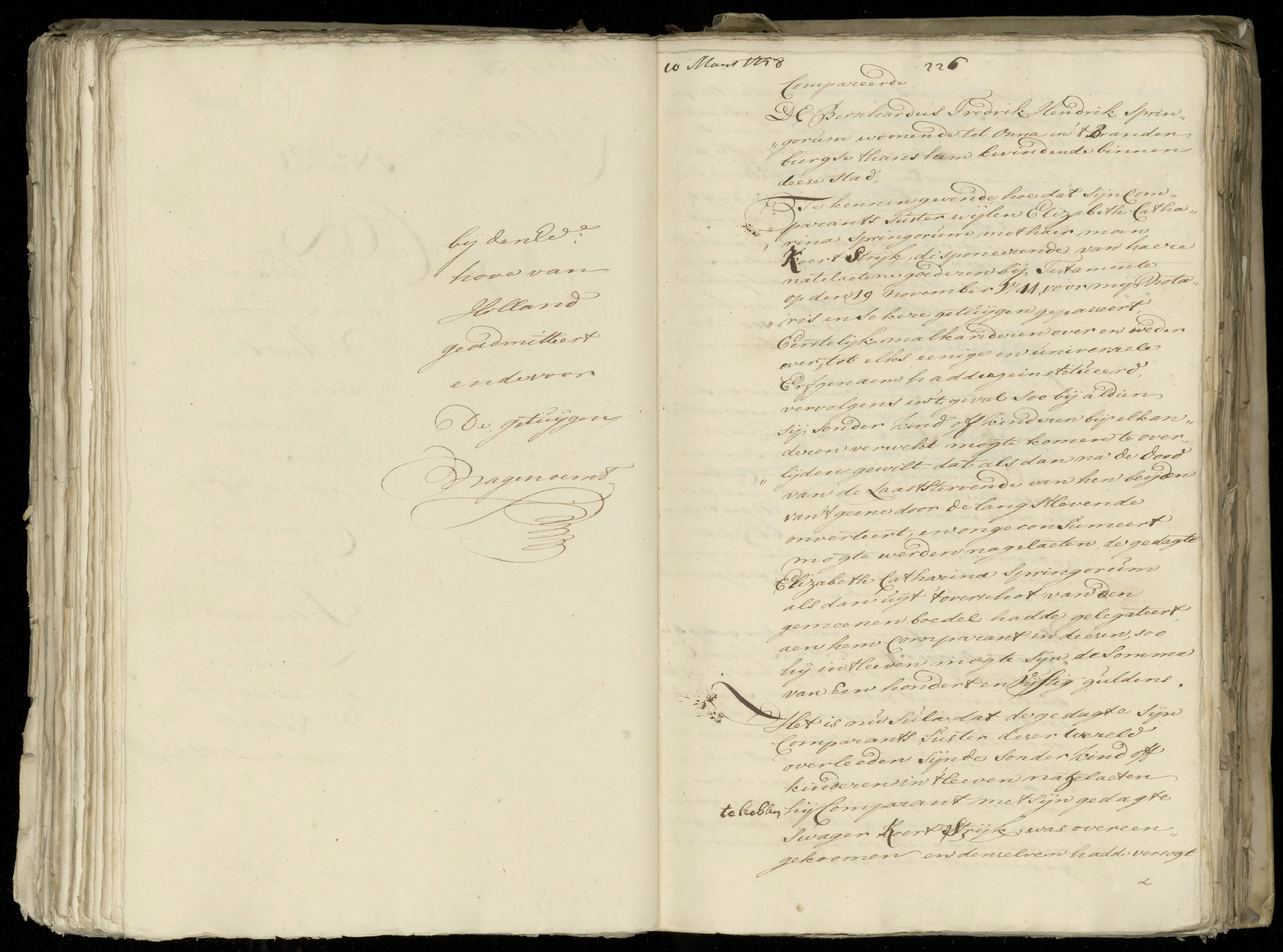 On 10 March 1758, a notarial receipt (kwitantie) was drawn up before the Amsterdam notary Salomon Dorper, involving Koert Strijk and Bernardus Fredrik Hendrik Springorum, the brother of the deceased Elisabeth Catharina Springorum. The document reflects the financial settlement of matters relating to her estate, following her burial on 11 January 1758.