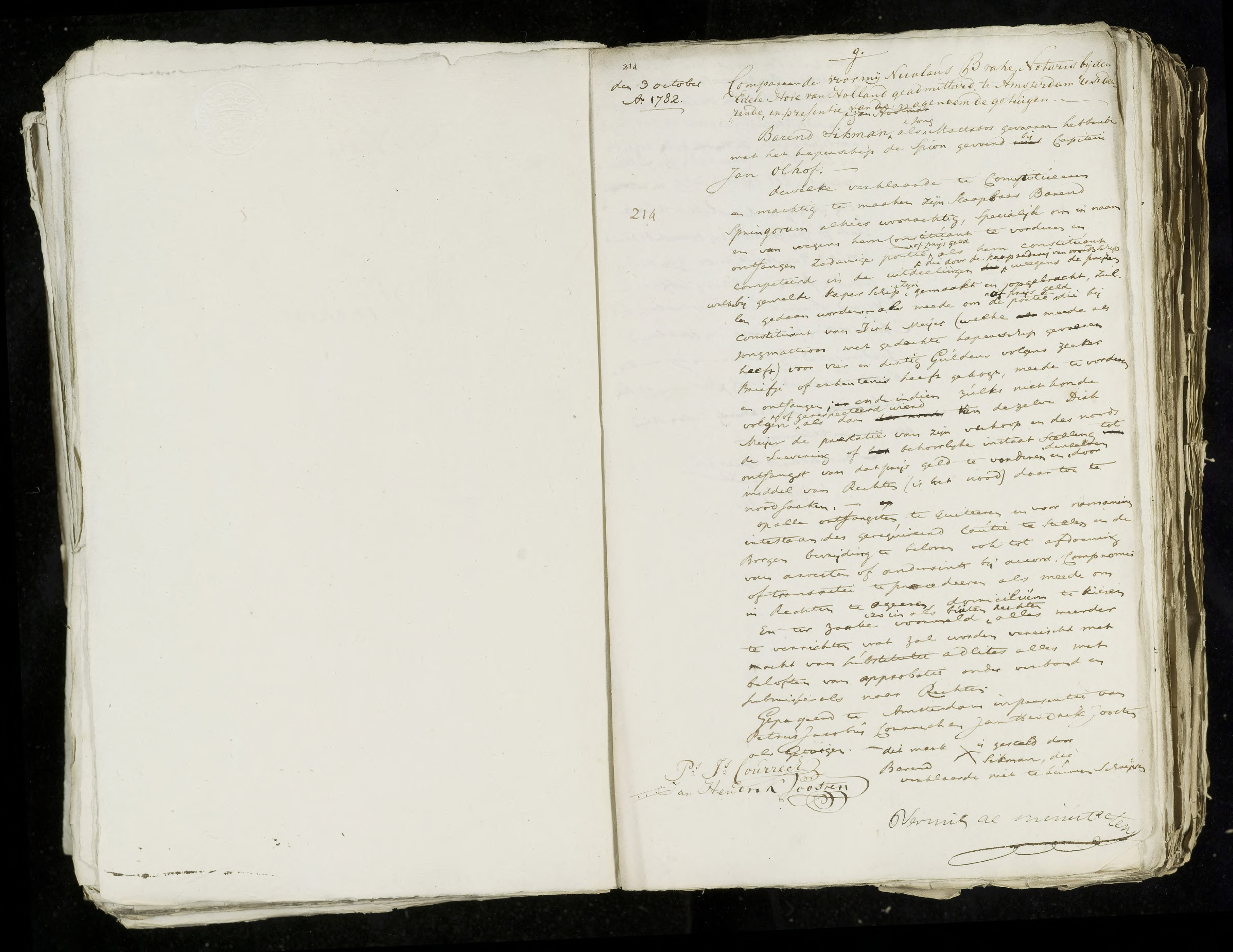 A notarial act was drawn up in Amsterdam in which Barend Likman, having served as a young sailor aboard the privateer ship De Spion under Captain Jan Olhoff, appointed kaapbaas Barend Springorum as his prize agent. Springorum was authorized to claim and receive Likmanâs share in the distributions of prize money arising from captures made by the ship. The mandate also included the right to collect an additional share purchased from fellow sailor Dirk Meijer and, if necessary, to enforce payment through legal means.