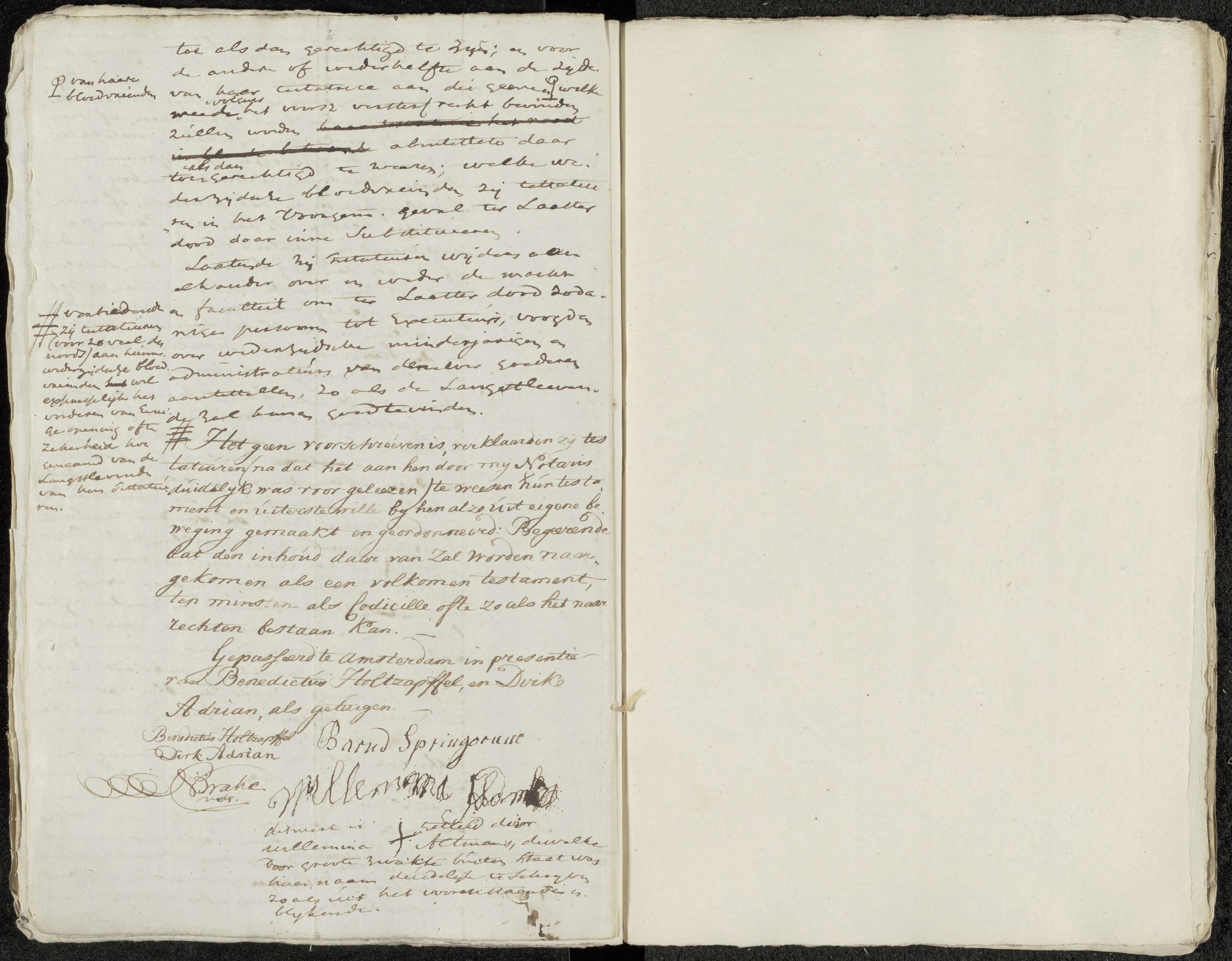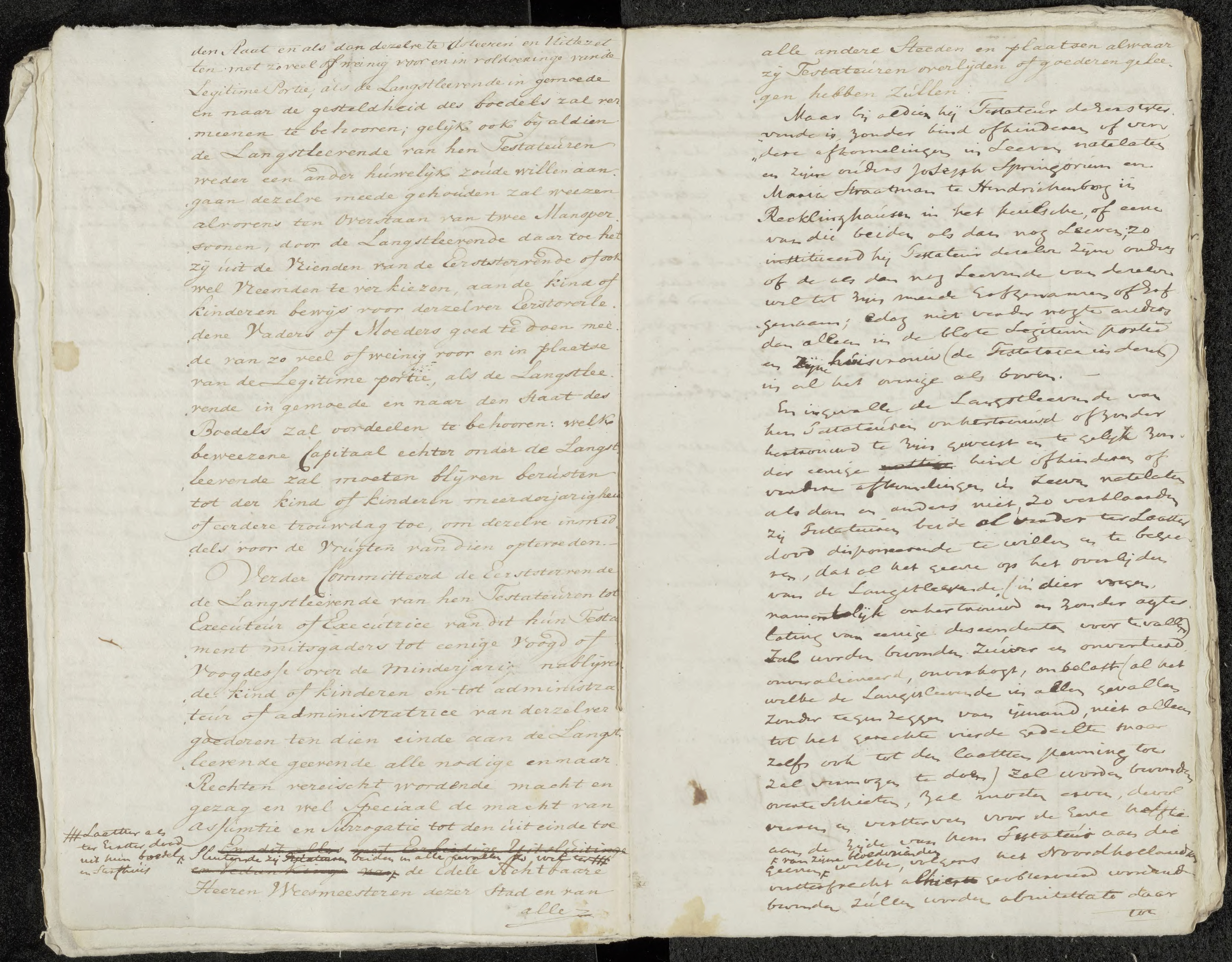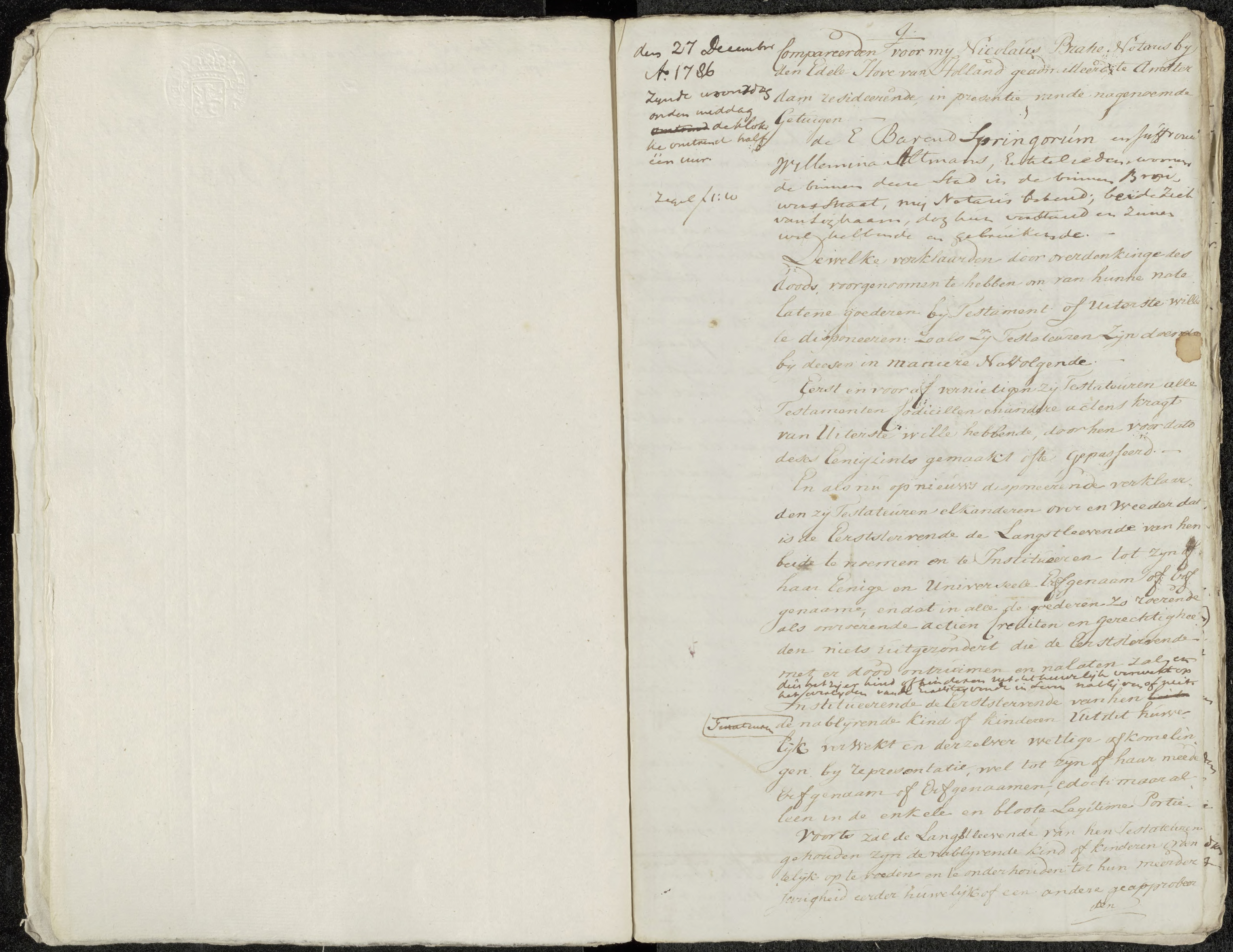 On 27 December 1786, Barend Springorum and his wife Willemina Altmans appeared before the notary Nicolaus Bratie in Amsterdam to declare their last will. Although both were infirm in body, they were declared sound of mind and fully capable of making a testament. In view of the certainty of death, they resolved to dispose of their worldly goods and estate by way of a joint last will.