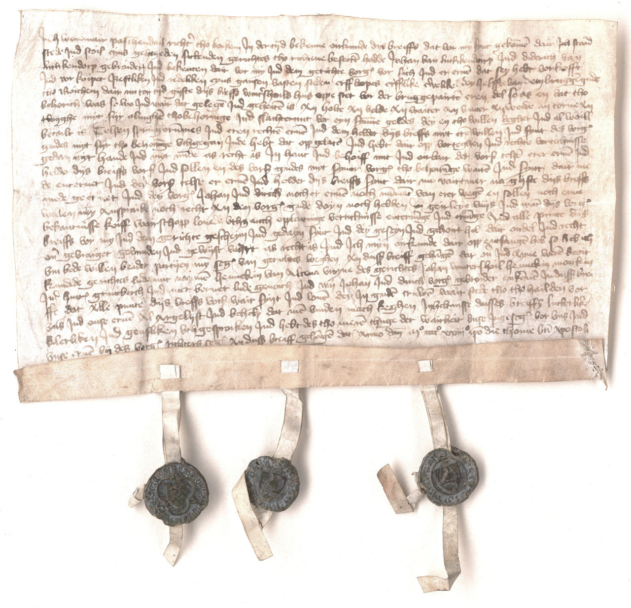 In 1423, before the court of Bochum, the brothers Johan and Diderich van Lutsikendorp sold a hereditary property near the bridge, together with all associated lands, rights, and appurtenances, to Celse Springorum and her lawful heirs. The sellers declared the purchase price fully paid and formally renounced all present and future claims, extending this renunciation to their own heirs. The transaction was publicly confirmed before the judge and witnesses, sealed as a valid and binding court charter, and ratified on 21 December 1423. This document is among the earliest known records to mention the name Springorum.
