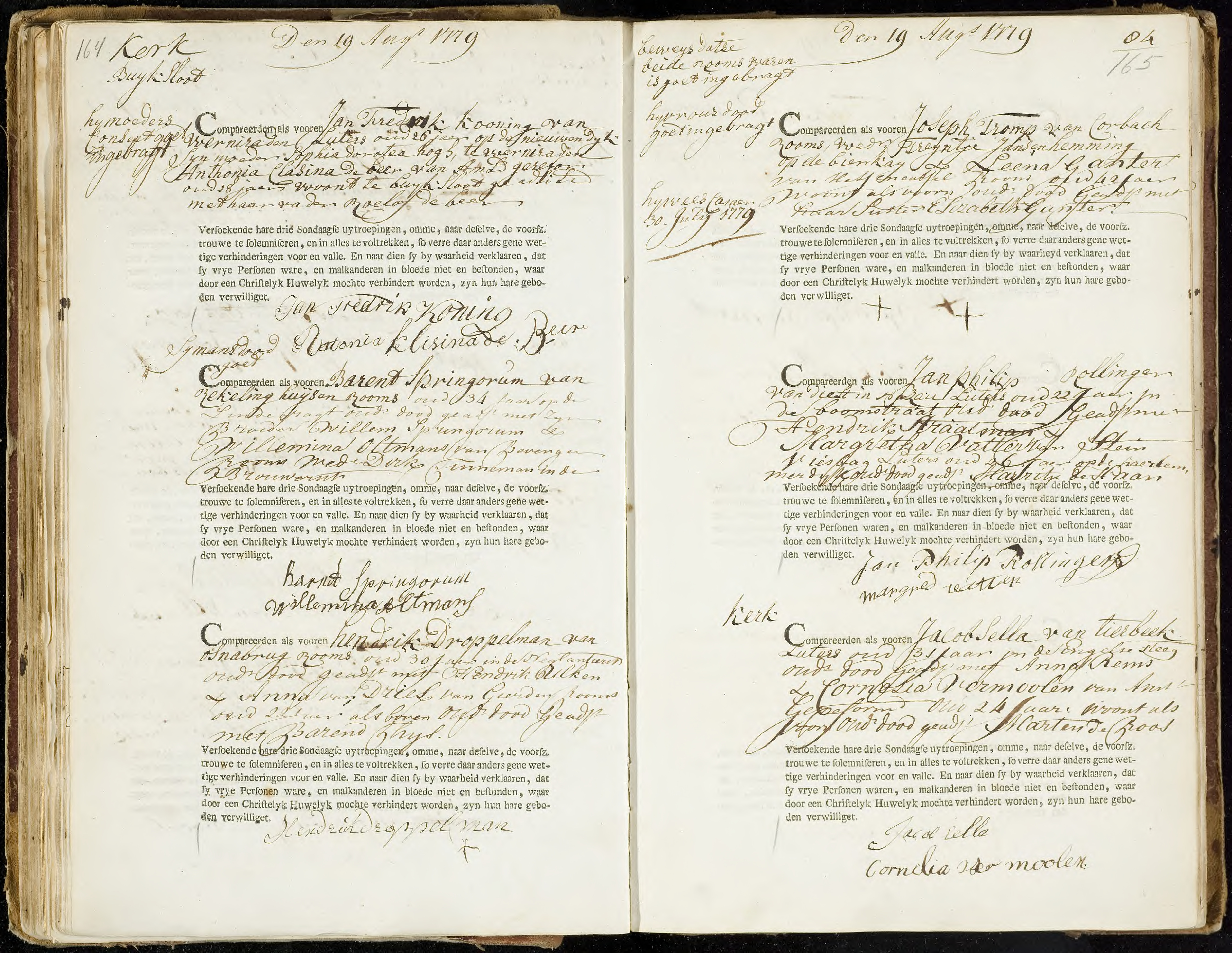On 19 August 1779, Barend Springorum and Willemina Altmans were recorded in the Amsterdam ondertrouw (marriage banns) register. The entry appears in the marriage intentions of the PUI (Huwelijksintekeningen van de PUI). Willemina is noted as having been previously married to Dirk Tinneman.